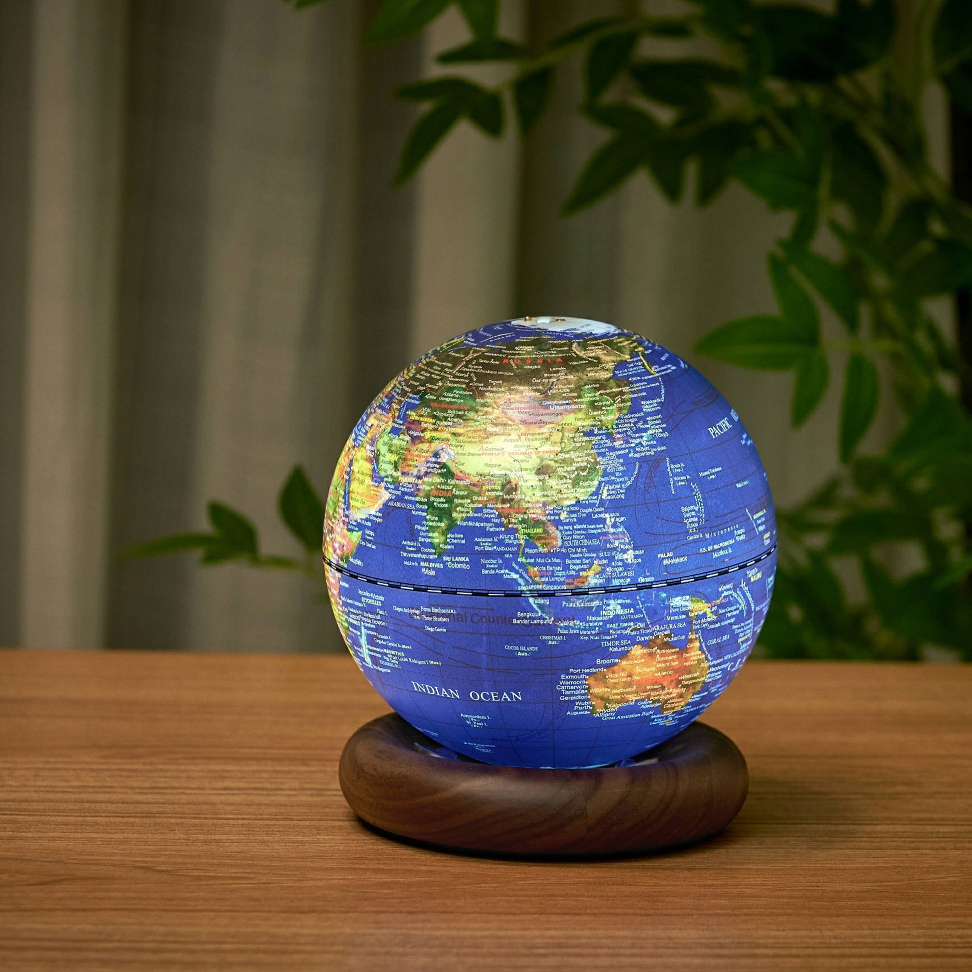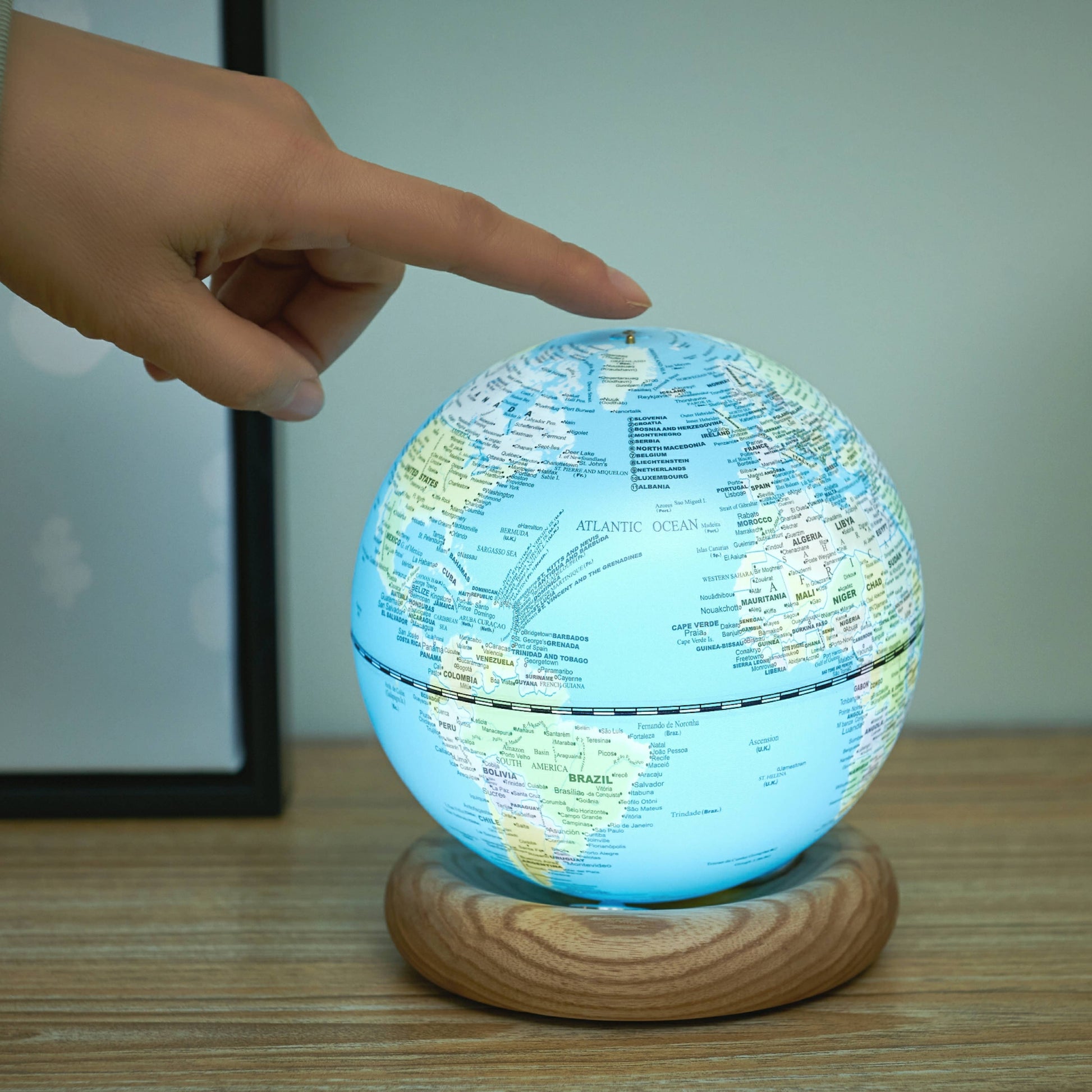 Világítsa meg terét az AtlasGlobe lámpával, amely két különböző kivitelben kapható. Válasszon a szellős világoskék gömb és a makulátlan fehér kőrisfa talp, vagy a kifinomult sötétkék gömb és a gazdag diófa talp közül. Mindkét stílus Mini és Large méretben is elérhető. Világoskék gömb fehér kőrisfa talpon: Kikapcsolt állapotban ez a változat monokromatikus fehér világot mutat be, karcsú és modern megjelenést biztosítva. Amint bekapcsolják, a gömb színekben tör ki, bemutatva bolygónk vibráló és részletes térképét. Sötétkék gömb diófa talpon: A sötétkék gömb kikapcsolt állapotban mély kék tónusaival titokzatos vonzerőt hordoz. Bekapcsolva a világot kontrasztos, színes kijelzővel tárja fel, feltűnő vizuális hatást keltve, amely magával ragad és oktat. Az AtlasGlobe lámpa kezelése tapintás élvezete. A gömb tetején lévő rézgomb egyszerű érintésével a lámpa be- vagy kikapcsolható. Hosszabb érintéssel a fény a kívánt fényerőre szabályozható a lágyabb pillanatokhoz.