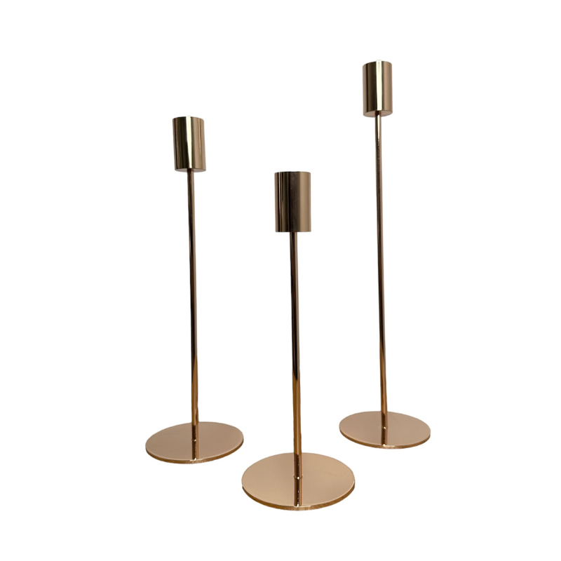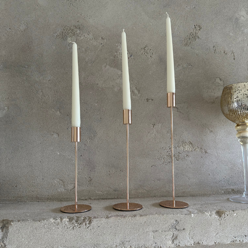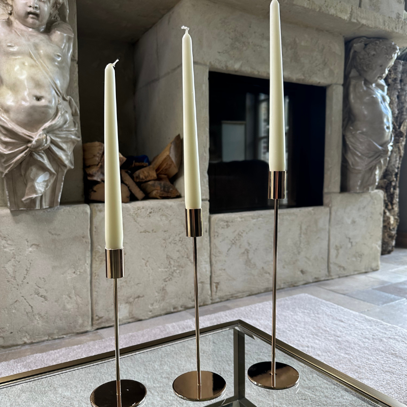 Vigyen egy csipetnyi modern eleganciát bármely belső térbe ezzel a három minimalista fém gyertyatartóból álló szettel. A letisztult vonalak és a karcsú dizájn tökéletessé teszik ezeket a gyertyatartókat azok számára, akik szeretik a minimalista és stílusos dekorációt. A gyertyatartók fényűző arany bevonattal rendelkeznek, amely melegséget és kifinomultságot áraszt, így kitűnnek anélkül, hogy túlzottan dominálnának. Ideálisak étkezőasztalon, lerakóasztalon vagy egy stílusos szekrényben való használatra. A szett darabjai egyenként vagy együtt is elhelyezhetők a gyönyörű, szimmetrikus hatás érdekében. Magas gyertyákhoz alkalmasak, meleg fényt és kifinomult hangulatot kölcsönöznek minden helyiségnek. Kis gyertyatartó magassága: 22 cm Közepes gyertyatartó magassága: 27 cm Nagy gyertyatartó magassága: 32 cm